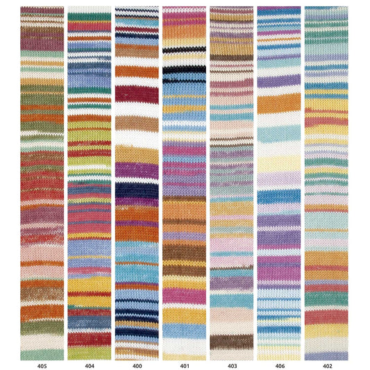 Katia Fair Cotton Diverso is een bijzondere uitvoering van het bekende biologische katoengaren van Katia. Net als de andere Fair Cotton garens is het 100% biologisch en GOTS-gecertificeerd, maar wat Diverso uniek maakt is het speelse kleurverloop. In plaats van een vaste overgang, wisselen de kleuren op onregelmatige en verrassende momenten, wat elk project uniek maakt.