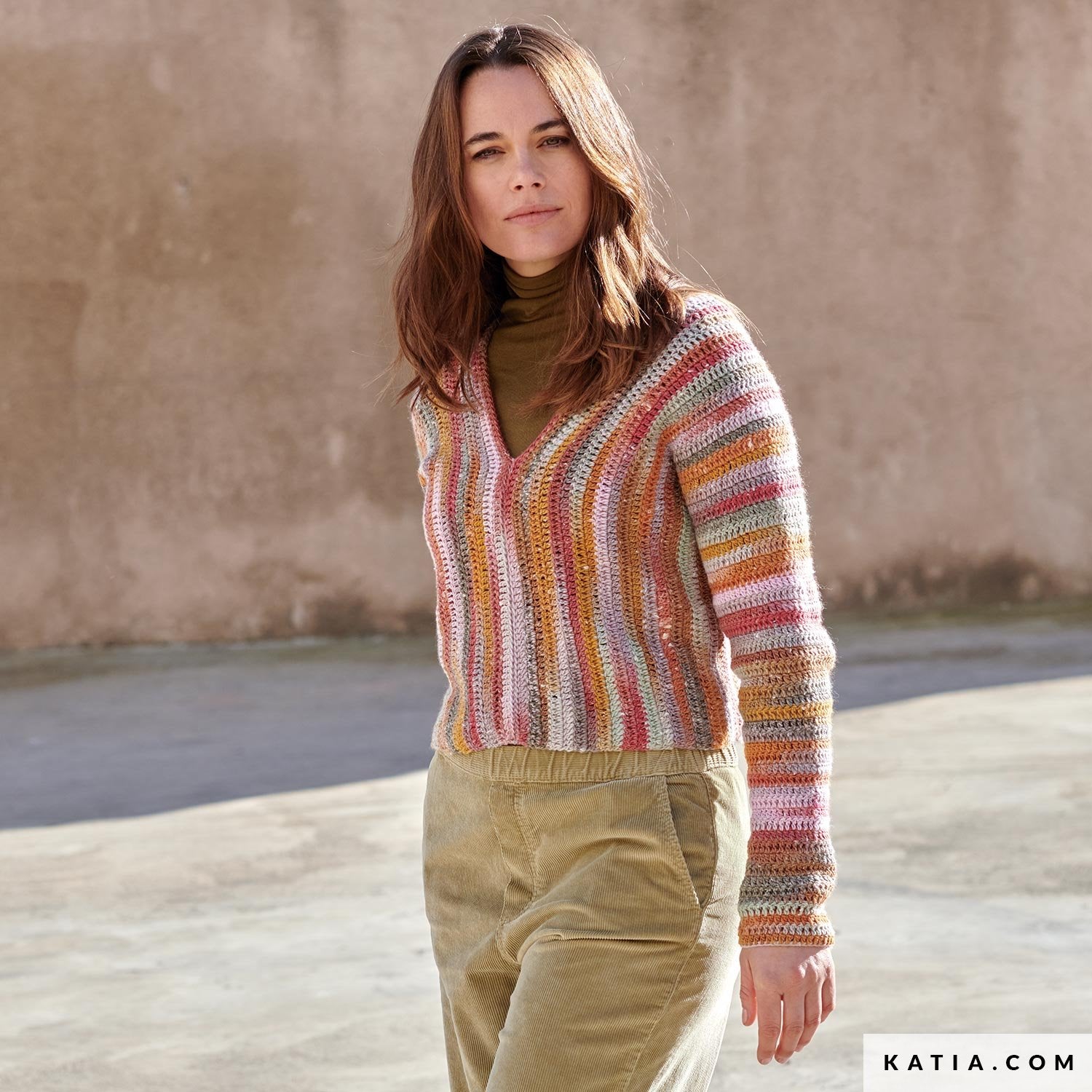 De Trui Hiro is een kleurrijke en soepelvallende gehaakte trui met een speels streepeffect dat vanzelf ontstaat door het prachtige Katia Concept Hiro garen. Dit garen combineert 94% extrafijne merinowol met 6% zijde – zacht op de huid en met een subtiele glans. Een fijn draagbare trui voor frisse dagen in het voorjaar of het najaar.